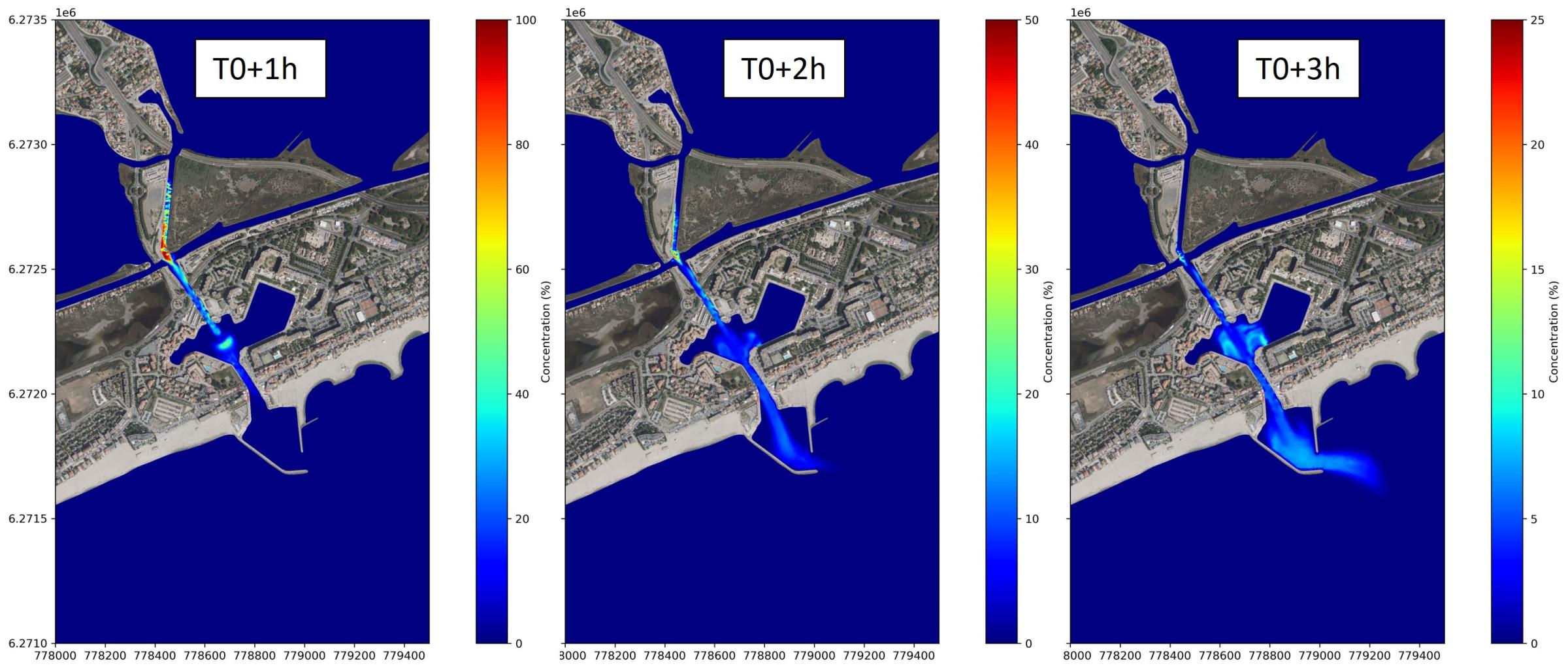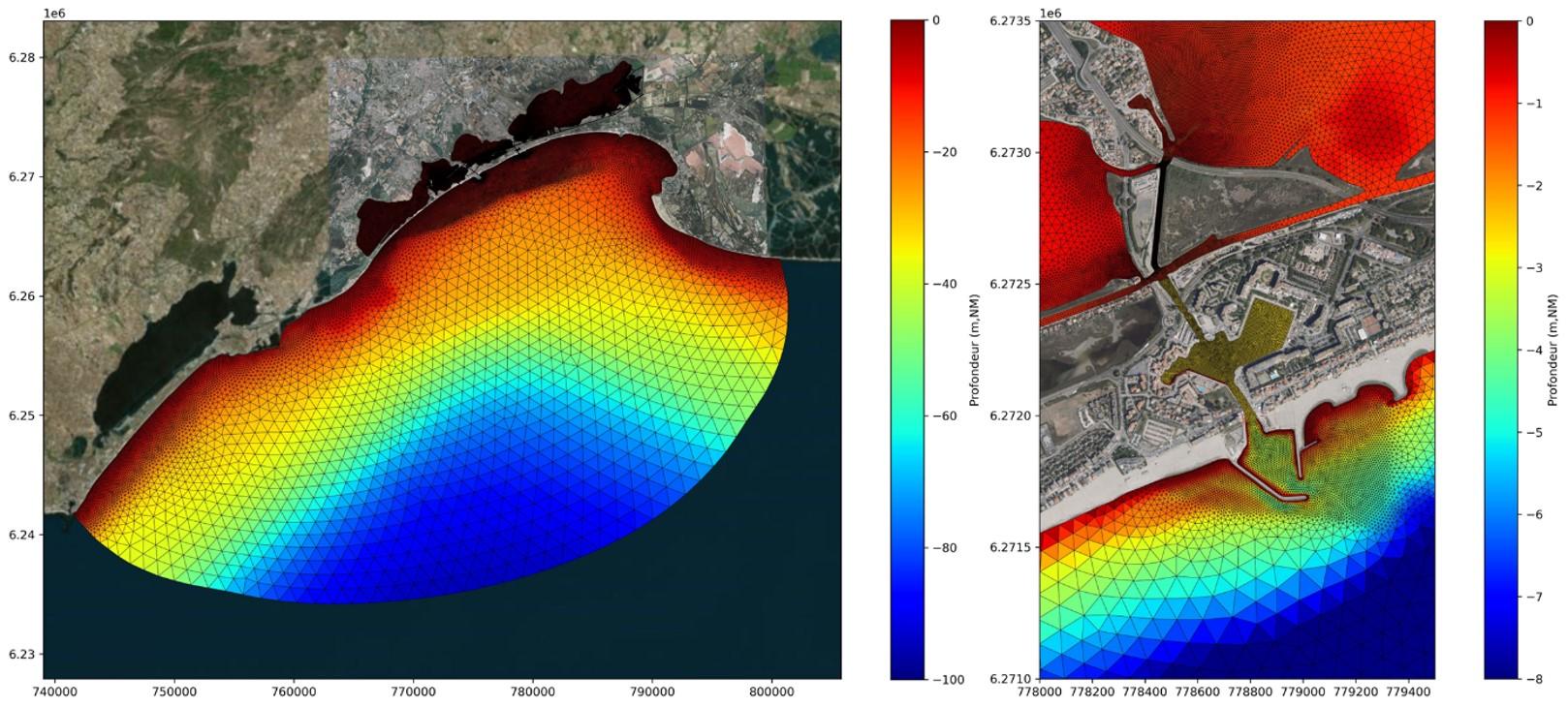 Etude des effets d'un projet d'aménagement de la passe entre l'étang de l'Or et le port de Carnon (secteur de l'Avranche, Pérols). Modélisation hydrodynamique (SCHISM) : analyse des courants et échanges mer/étangs, renouvellement des eaux, aléas inondation et submersion marine, dynamique sédimentaire. Estimation des efforts hydrodynamiques sur les barges.