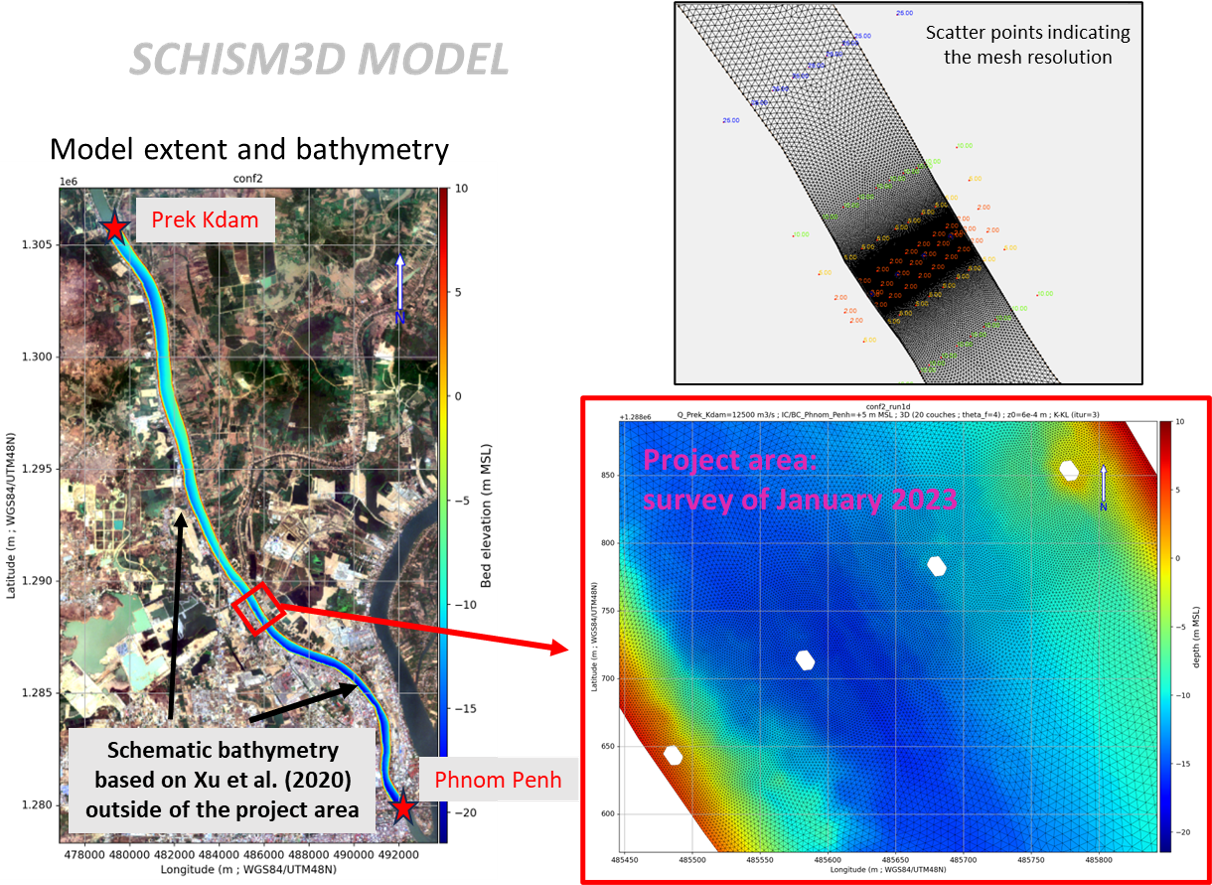 Projet de traversée sous-fluviale du Tonlé-Sap à Phnom-Penh pour alimenter une usine d’eau potable. Etude (par modélisation) des conditions de courant de projet, et conception/dimensionnement d’un ouvrage de sécurisation d’une conduite posée au fond.